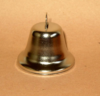 Silver metal bell with ringer and hole to hang it up. 2in across, 1-3/4in high.