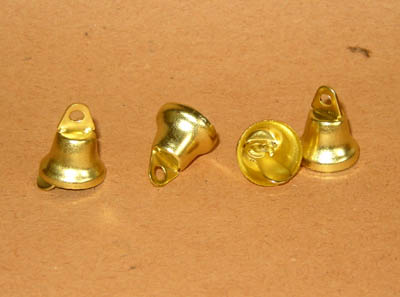 Item # 5329 - Price $1.50 UPC # 045461053295 Four 14mm gold metal bells to hang in your tower. Each has a ringer and a hole to hang it up. 5/8in high 1/2in across. Last updated on 07/07/2007 |