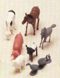 7001 6 misc farm animals including horse, cow, goat, sheep, pig, bull, etc. Sizes vary from 1in to 3in. Price $2.00